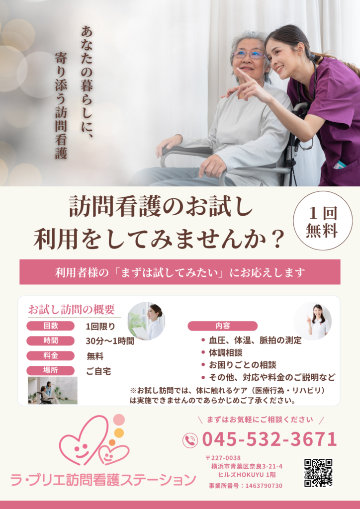 「訪問看護って何をしてくれるの?」「続けられるか心配…」「どんな人が来るの?」そのようなお声にお応えして、1回限り無料にて訪問看護のお試し訪問を行っております!ご自宅に当ステーションスタッフがお伺いして、血圧・体温・脈拍の測定、体調に関するご相談や訪問看護を実際に受けるにあたってのご説明もいたします。(時間:30分~1時間程度)※お試し訪問では、身体に触れる医療行為やリハビリ等のケアは行えませんのであらかじめご了承ください。まずはお気軽にご相談ください!